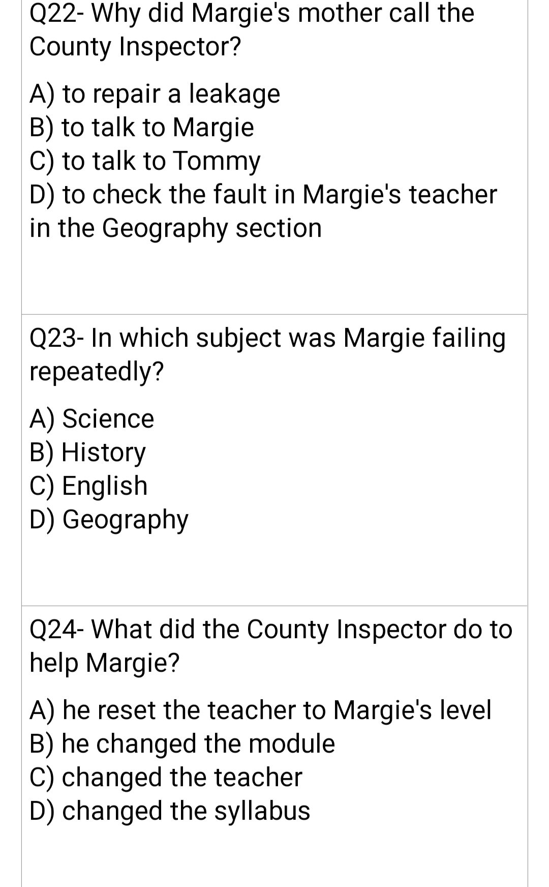 ~Margie’s mother called for the county inspector when she saw the never-ending degrading result of Margie. The county Inspector realised the fault and adjusted the geography sector according to Margie’s incorporance. He also comforted Mrs. jones with the knowledgeable and satisfactory progress Margie had been showing.